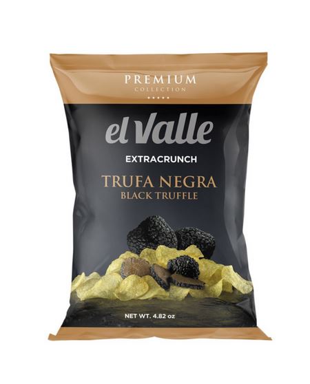 Nejtradičnější varianta smažených bramborových lupínků v luxusní prémiové podobě. Opravdu velké lupínky, jedinečné křupnutí u každého sousta a ryzí chuť brambor pečlivě smažených ve 100% slunečnicovém oleji. El Valle CHipsy s příchutí Černý lanýž zaujmou již jen na pohled - troufáme si tvrdit, že se ve Španělsku podařilo stvořit nekrásnější pytlík chipsů v historii :-)