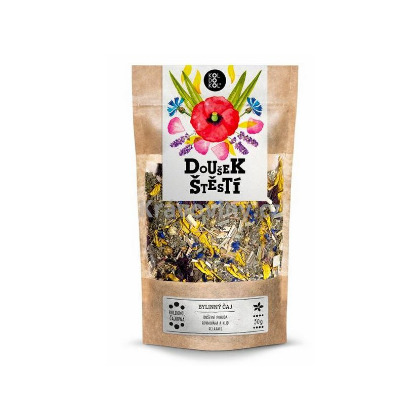Štěstí má mnoho podob. Jednou z nich je čajová směs Doušek štěstí. Barevná směs pečlivě vybraných bylinek potěší oko, pak nos a v závěru zahřeje na duši. Štěstí se totiž skrývá i v každodenních maličkostech. Tak si ho vychutnejte doplna!