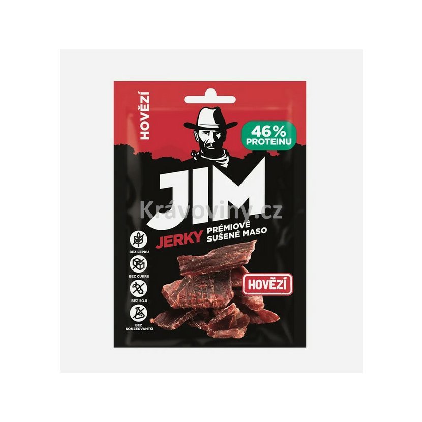 Jim Jerky Hovězí je poctivé sušené maso z kvalitního hovězího, které si zamilujete na první sousto. Vyrábí se tradiční metodou pomalého sušení, díky které si zachovává plnou chuť, šťavnatost a vysoký obsah bílkovin.