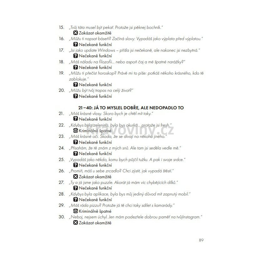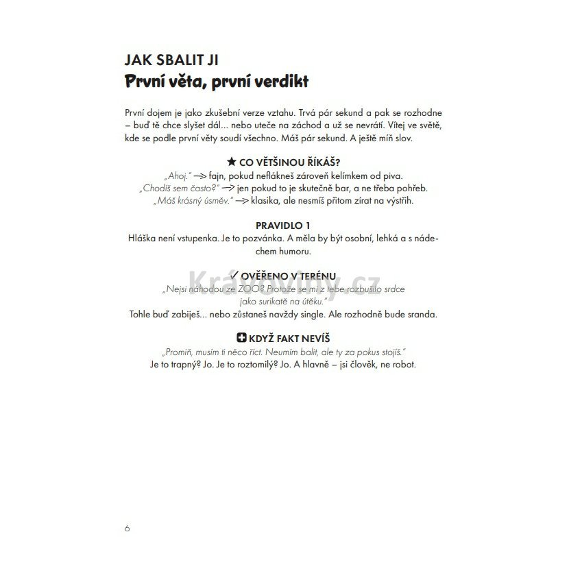 Tahle příručka tě naučí, že první věta není všechno – ale může být začátek všeho. Skvělý dárek pro single kamarády i jako odlehčené čtení pro páry! Tahle kniha ti dodá odvahu i šarm – abys při balení neztratil hlavu, koule ani budoucnost. Rozměr: 130 × 170 mm, měkká vazba. Počet stran: 100. ISBN: 978-80-909636-1-0