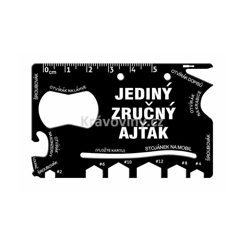 Jistě se vám už někdy stalo, že jste potřebovali mít u sebe nějaké to nářadí nebo otvírák. Ideálním řešením v této situaci je právě tato multifunkční karta z robustní nerezové oceli. Nyní může jediný zručný ajťák mít veškeré potřebné nářadí stále při ruce. Ocelová multifunkční karta je velice stylový a praktický doplněk každého modernímu muže a jeho hlavní výhodou je, že se vejde do každé peněženky, ale také dokáže nahradit až 18 různých nástrojů. Poslouží jako otvírák na láhve, otvírák na konzervy, 6 klíčů, 3 šroubováky, šroubovák na brýle, otvírák na krabice, pravítko, vytahovač hřebíků, stojánek na mobil, loupač ovoce, otvírák dopisů.