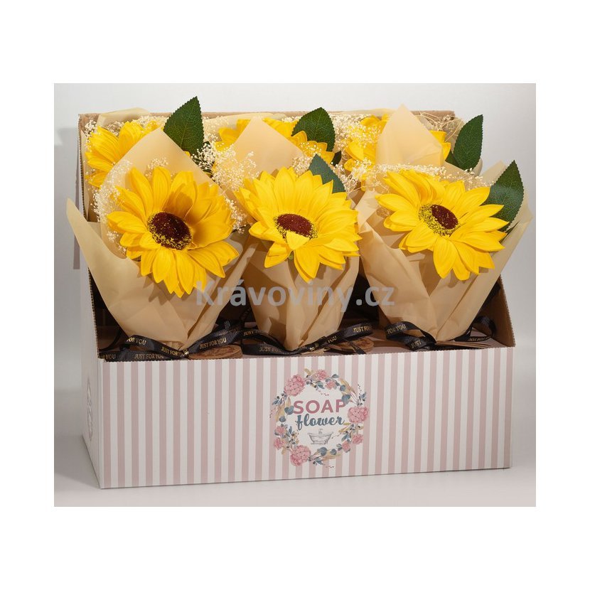 Balení obsahuje 1 ks mýdlové slunečnice uvázané v dárkové kytici.