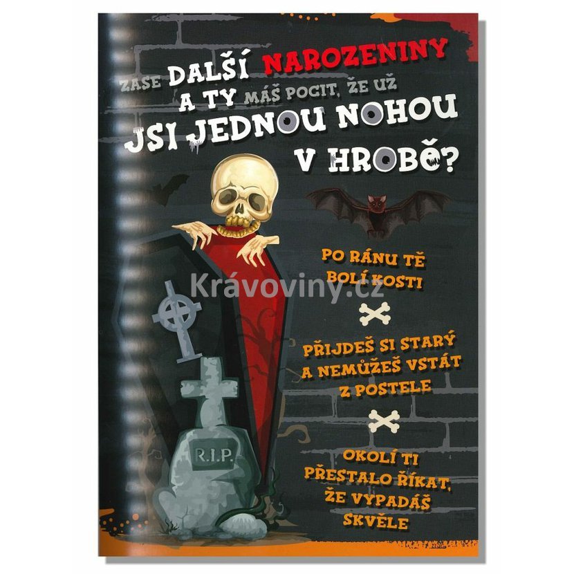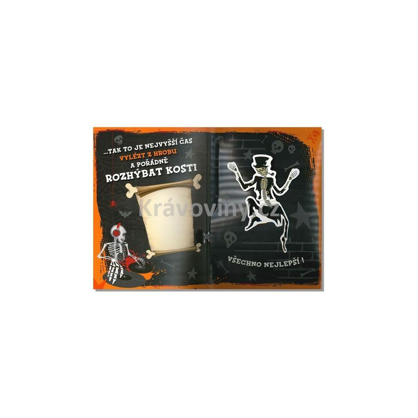 Vtipné narozeninové přání s překvapením, které oslavence jistě velice pobaví. Narozeninové přání po otevřenízavrže a začne hrát veselou melodii a navíc se roztančí postavička kostlivce. Uvnitř přáníčka je vtipný text, ale i dostatek místa na vlastní věnování či osobní vzkaz od srdce pro ještě větší radost.