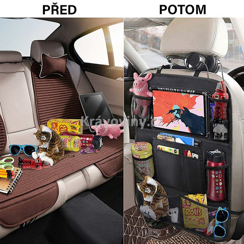 Organizér na zadní stranu předního sedadla usnadní cestování s rodinou. Organizér je vyroben z voděodolného materiálu. Nedrží tak na něm nečistoty a pohodlně se čistí. Stačí obyčejný navlhčený hadřík.
