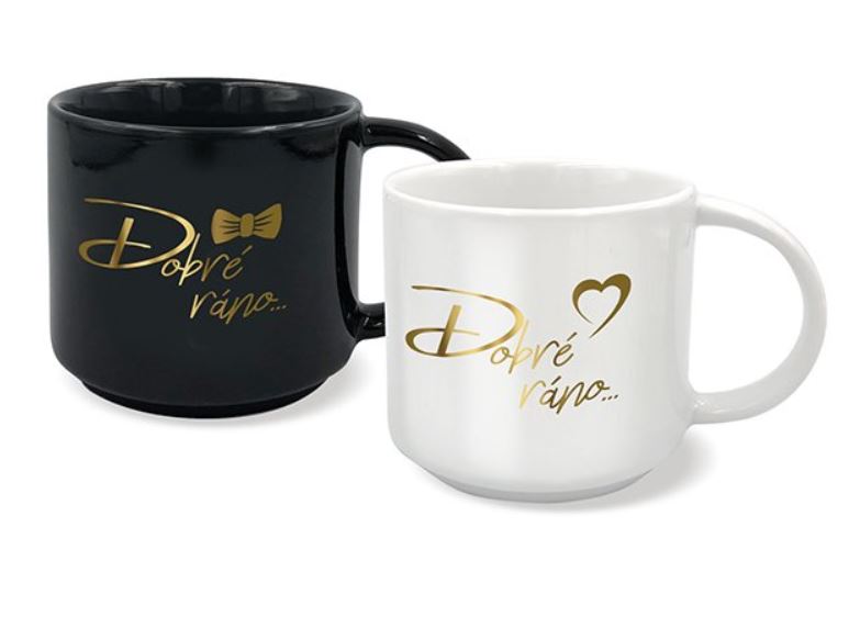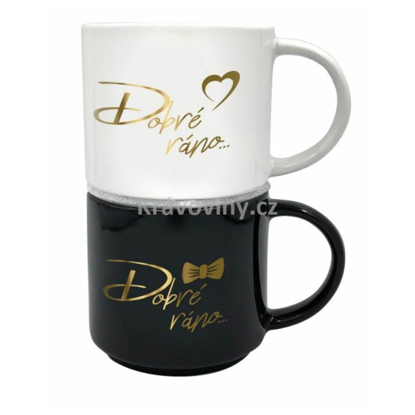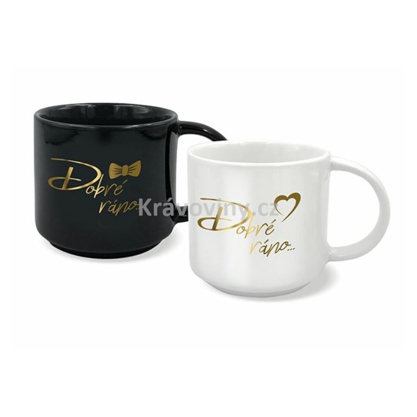 Set originálních hrnků pro pár se zlatými nápisy Dobré ráno.... Hledáte jediněčný svatební dar pro novomanžele, nebo drobnost, která bude nejen praktická, ale zároveň i potěší? Ve dvou se to lépe táhne, obdarujte své blízké sadou originálních keramických hrnečků na čaj či kávu, ať mohou společně začít krásný den. Romantický design a text „Dobré ráno...“ jim zpříjemní každé společné ráno.