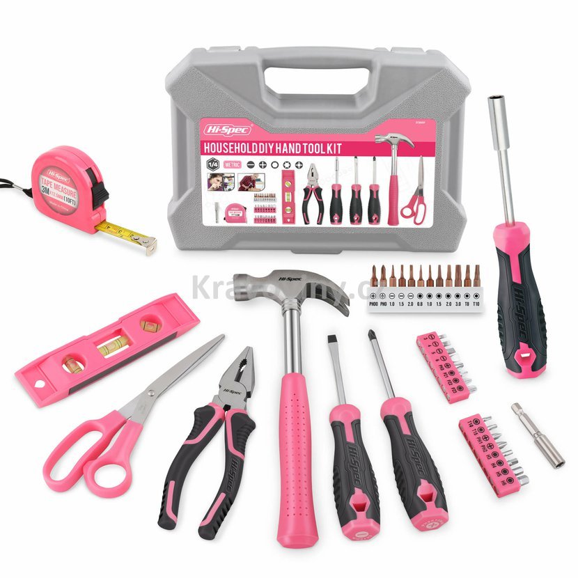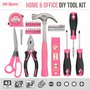 Praktická 42dílná sada růžového nářadí Hi-Spec pro domácnost, kancelář i dílnu. Obsahuje kladivo, šroubováky, metr, kleště, nůžky a bity v pevném kufříku.